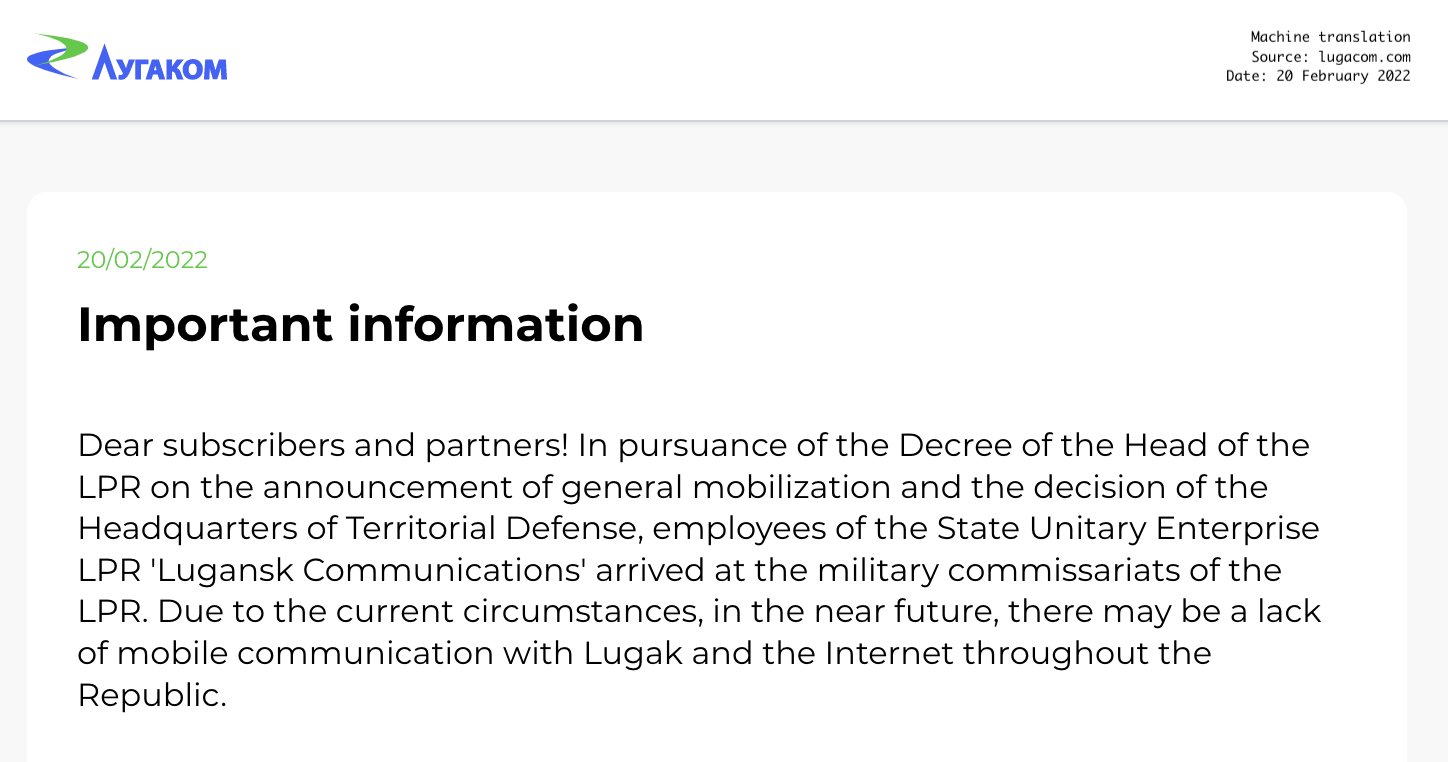 Netblocks On Twitter Confirmed At Least Two Internet Providers Serving Eastern Ukraine Via Crimea And Russia Are Now Experiencing A Partial Loss Of Connectivity As Of Sunday Morning The Disruptions Come